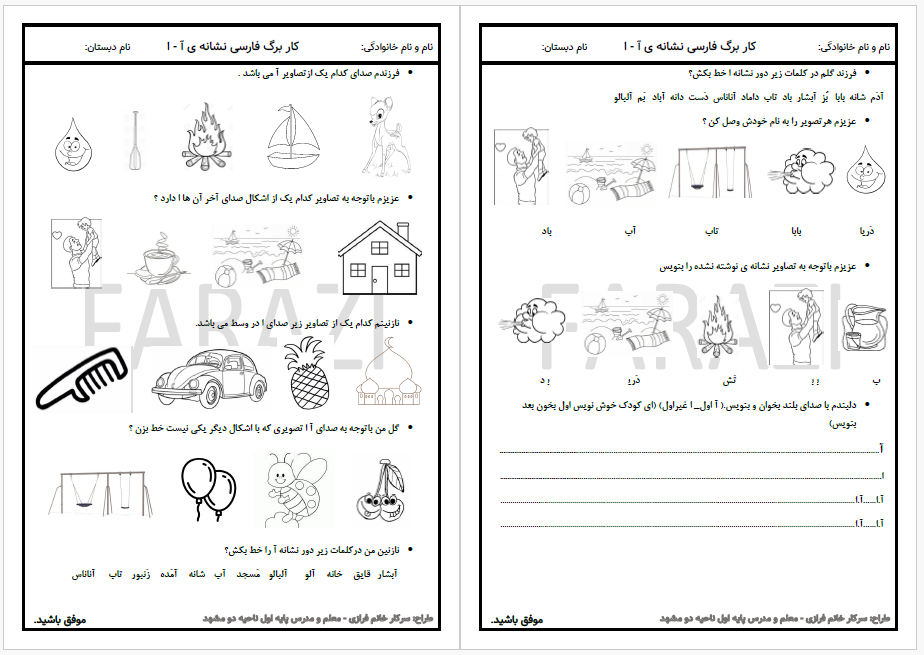 بسته آموزشی کاربرگ نشانه های 1 و 2 فارسی اول ابتدایی شامل 85 برگه با تصاویری زیبا و جذاب برای آموزش زبان فارسی اول ابتدایی است. این 85 برگه تصویری آموزشی مباحث اساسی زبان فارسی را به نوآموزان می آموزد و آنها را وادار می کند که بیشتر تمرین نمایند.